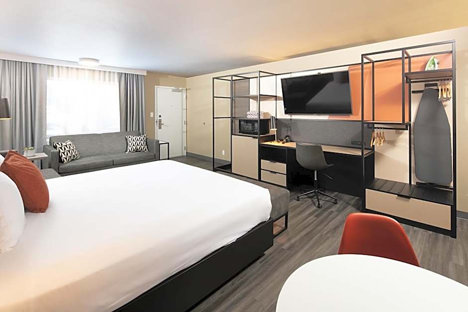 ADA features include levered door handles and lowered peep holes, handrails near toilet and shower, Braille room numbers, closed captioning on TV, and flashing ringer and amplified volume on the telephone.